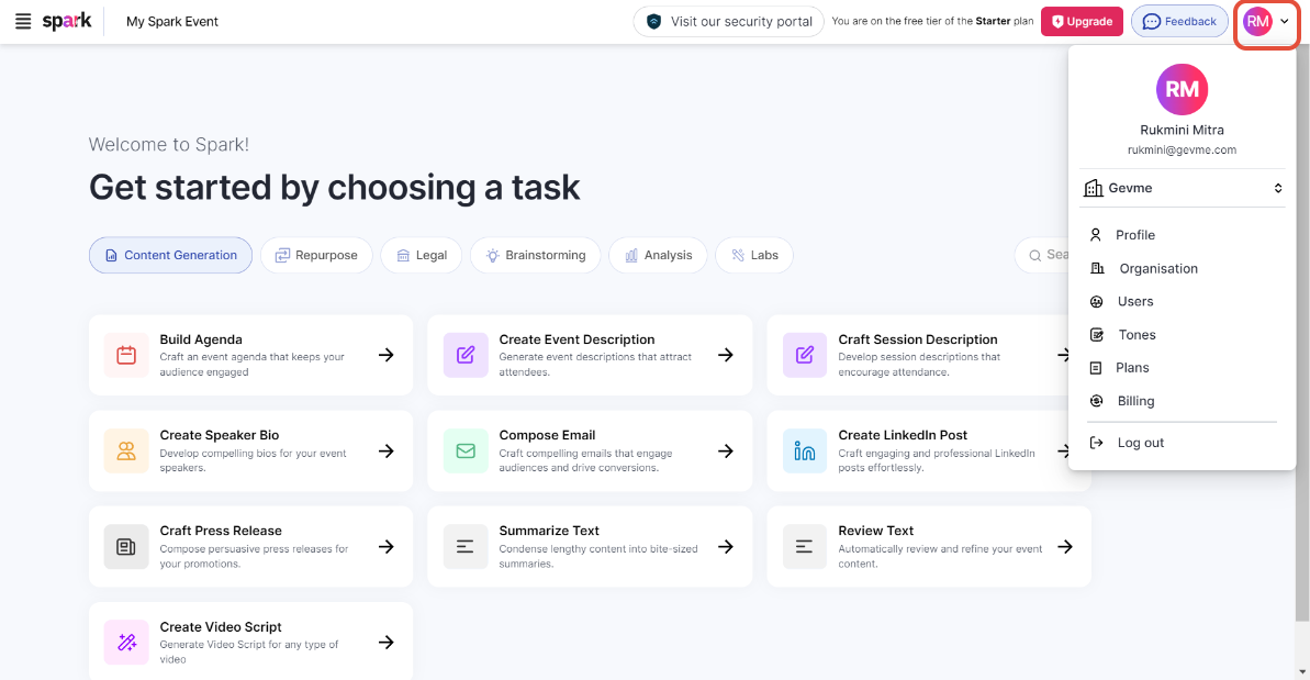 Once your Spark account is set up, you can manage various settings through the dashboard, accessible via the Profile menu dropdown in the top-right corner: