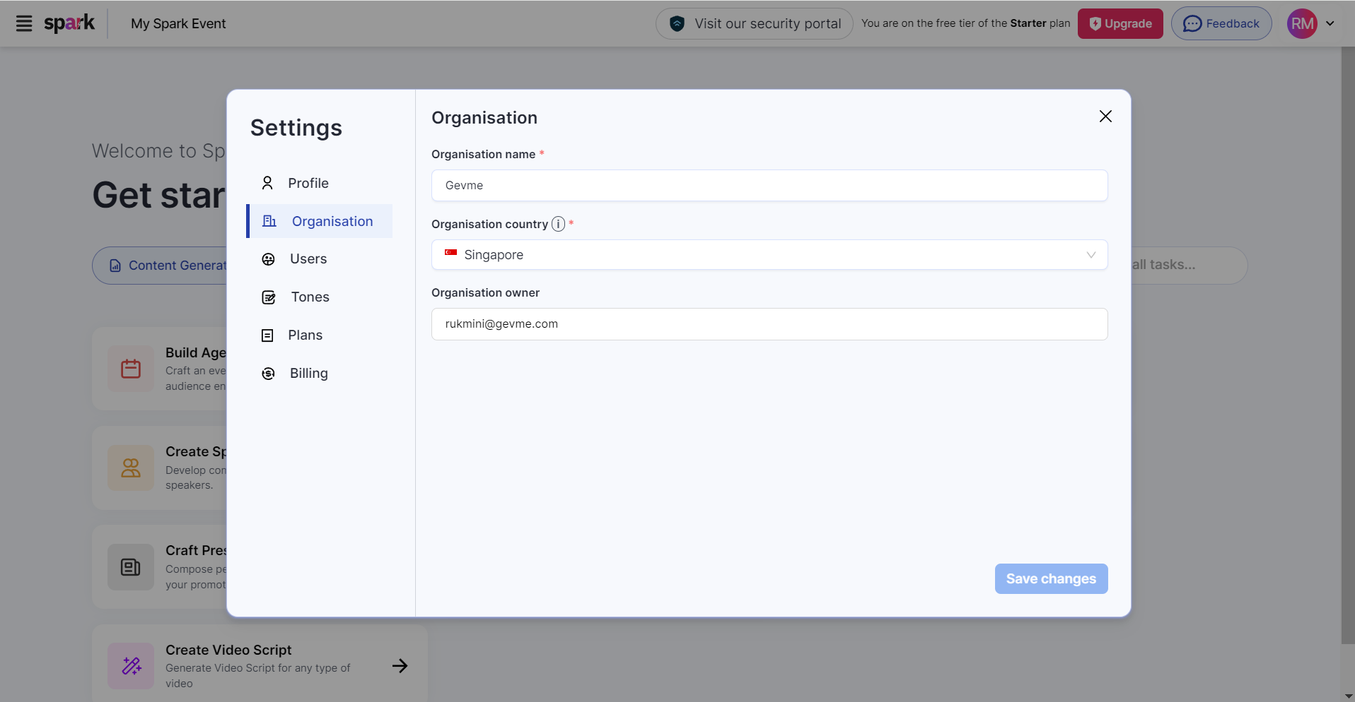 Manage your organization’s details, including its name, country, and the organization’s owner. Click Save Changes once done