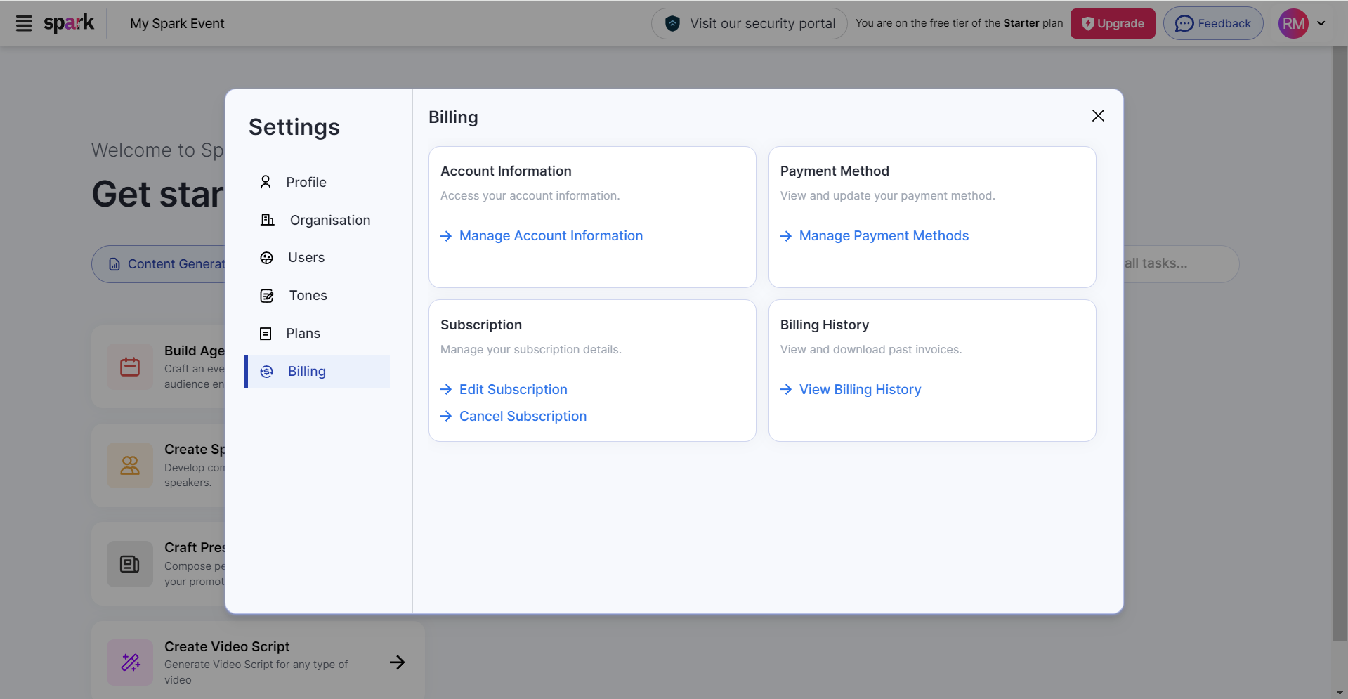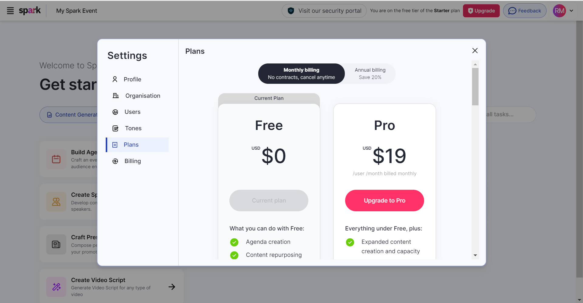View or change your current subscription plan. This section allows you to upgrade, downgrade, or review the features of your chosen plan. You can also choose Monthly or Annual Plan.