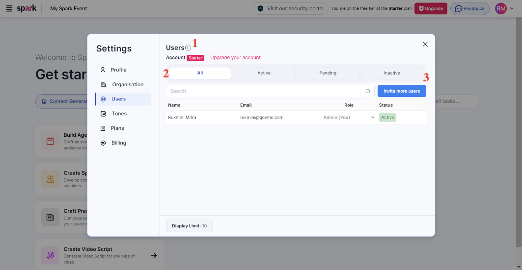 [1] User Quota: It states clearly your plan and how many users can be added to your organisation.